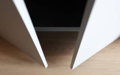 Superata la zona del disimpegno, per cui abbiamo realizzato un mobile moderno a incasso laccato grigio minerale, che sfrutta interamente l’altezza, si può accedere al primo dei due bagni: semplice ed essenziale, questo bagno è stato arredato con un mobile sospeso in legno naturale leggermente scurito con cassetti ammortizzati, su cui poggia un lavandino bianco geometrico.