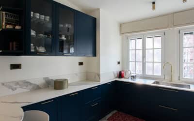 La cucina, tra gli ambienti più luminosi della casa data l’ampia finestra che si staglia sopra il lavello, si compone di una contrapposizione di colori molto netta tra il bianco e il blu navy, e la presenza di decori effetto marmo: la nota vittoriana si ritrova nella presenza delle vetrine da cui è possibile apprezzare tazzine e simili.